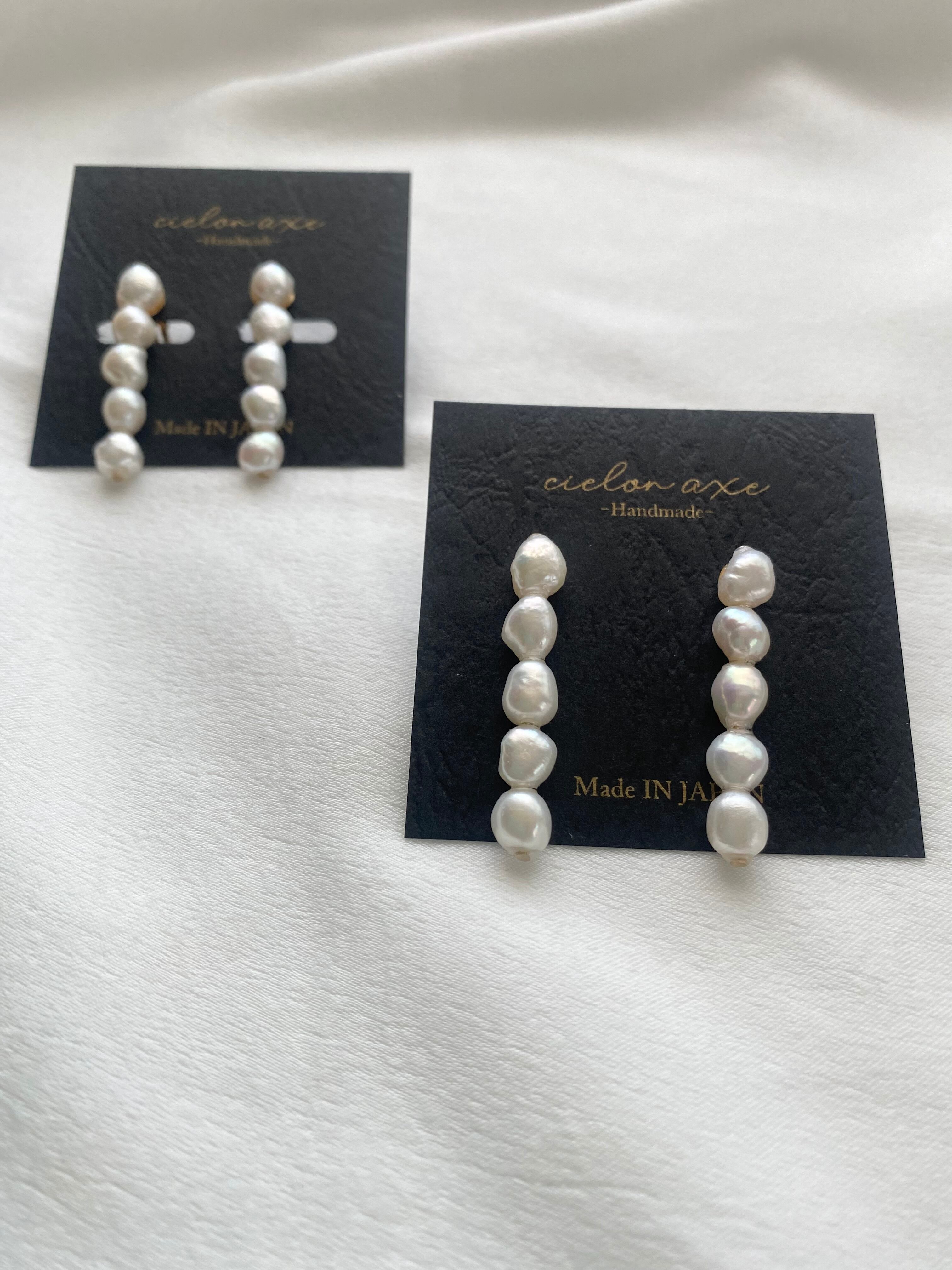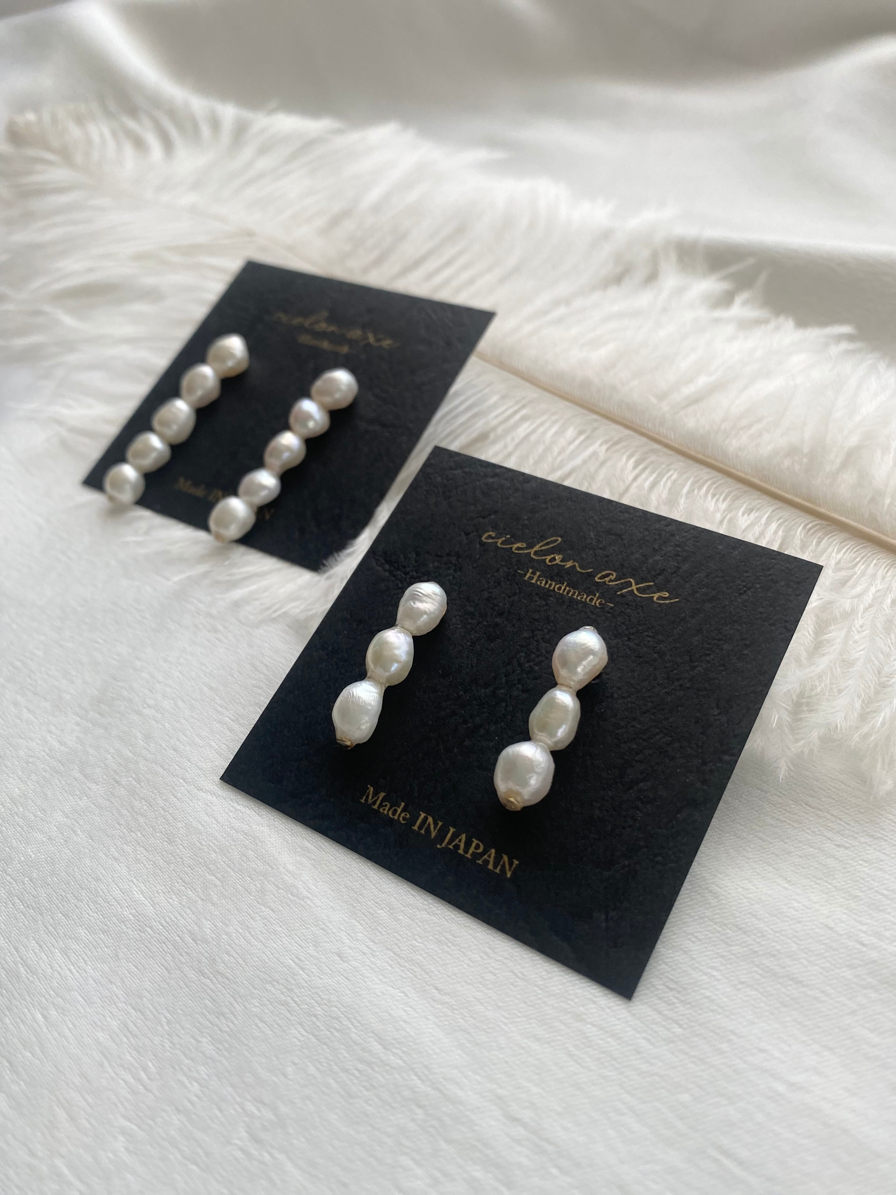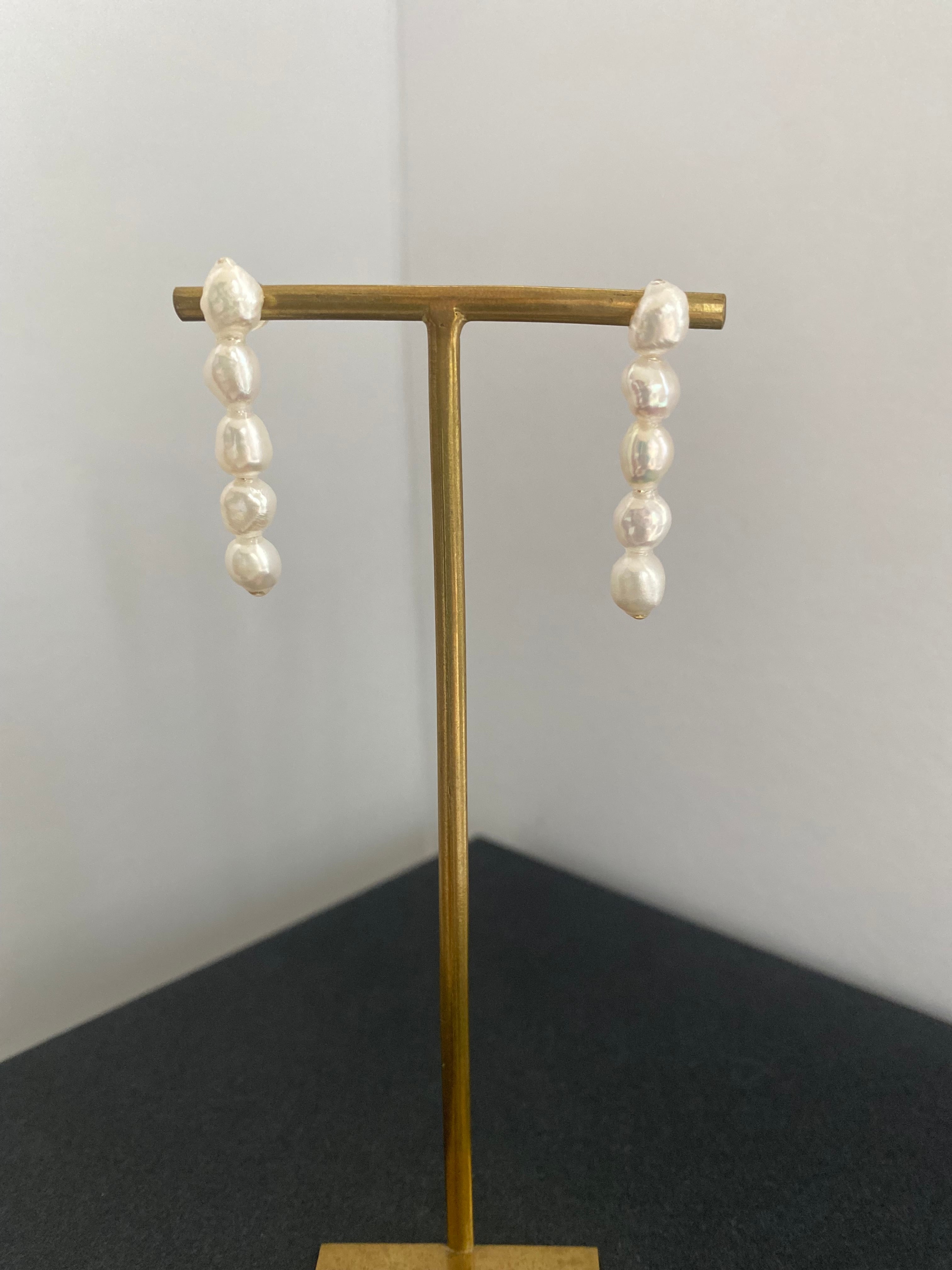 ひとつひとつ表情の異なるバロックパールを縦に連ね、耳元をすっきりと美しく見せてくれるデザインです。