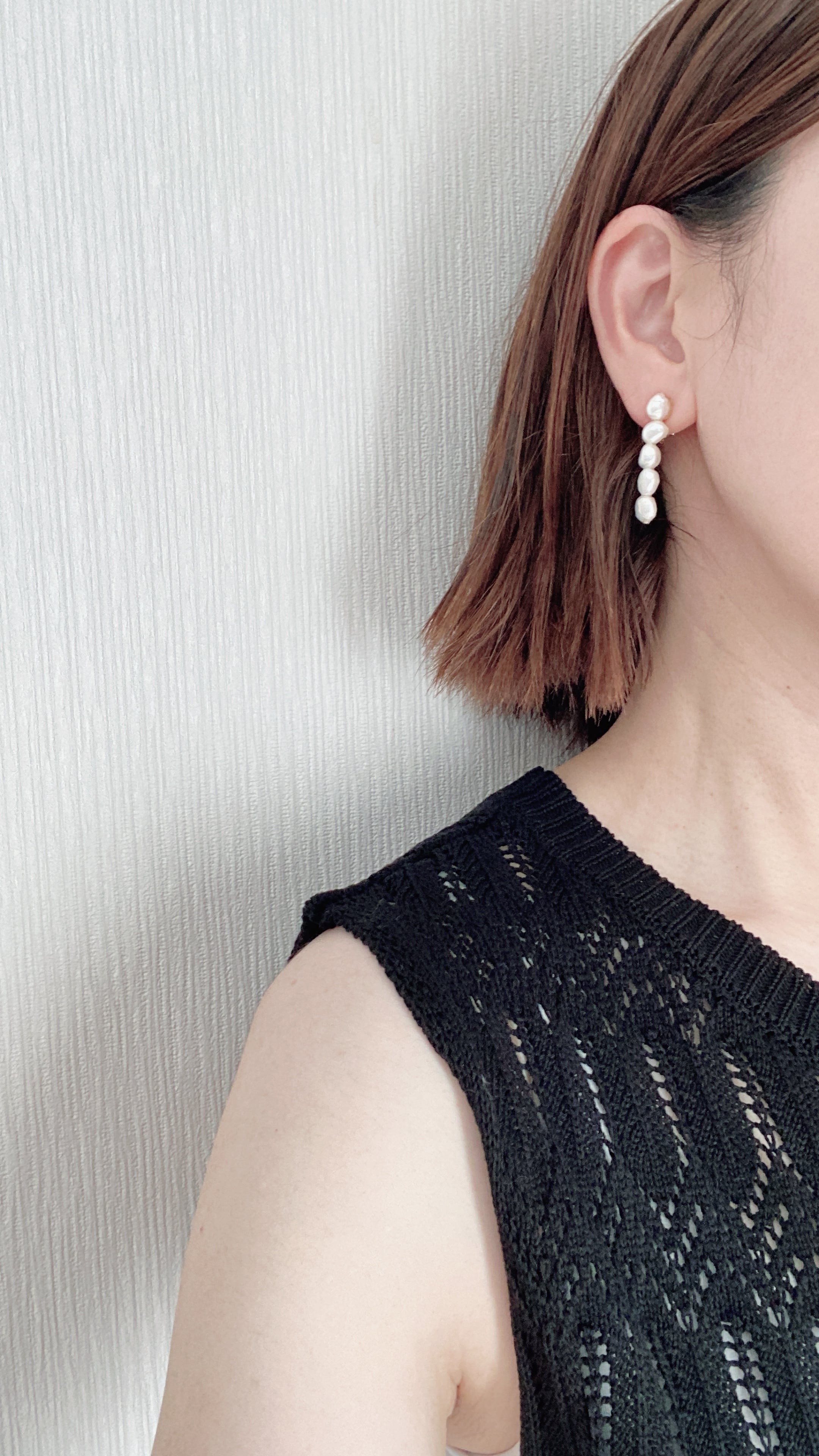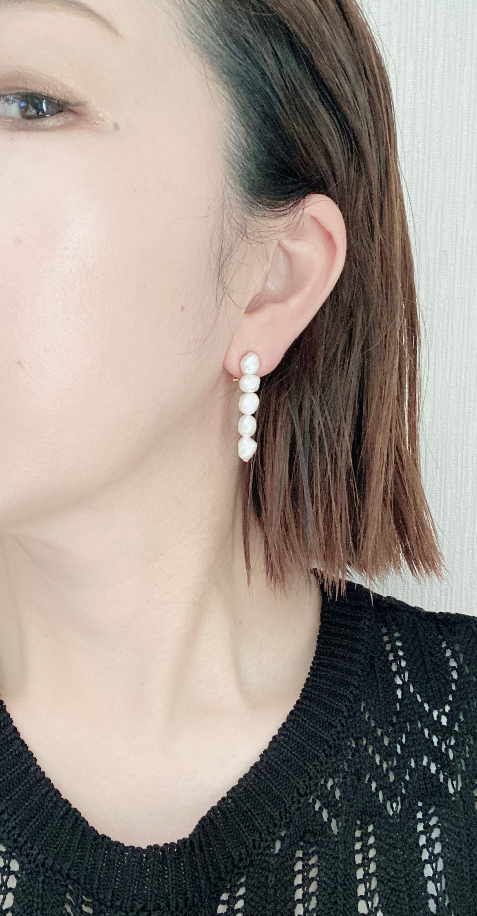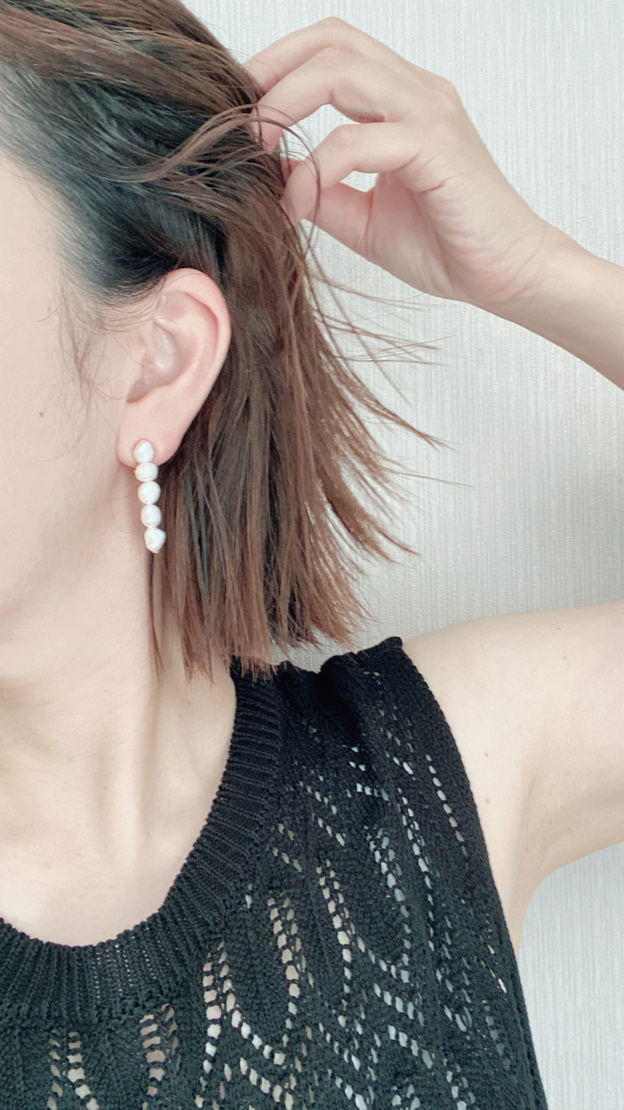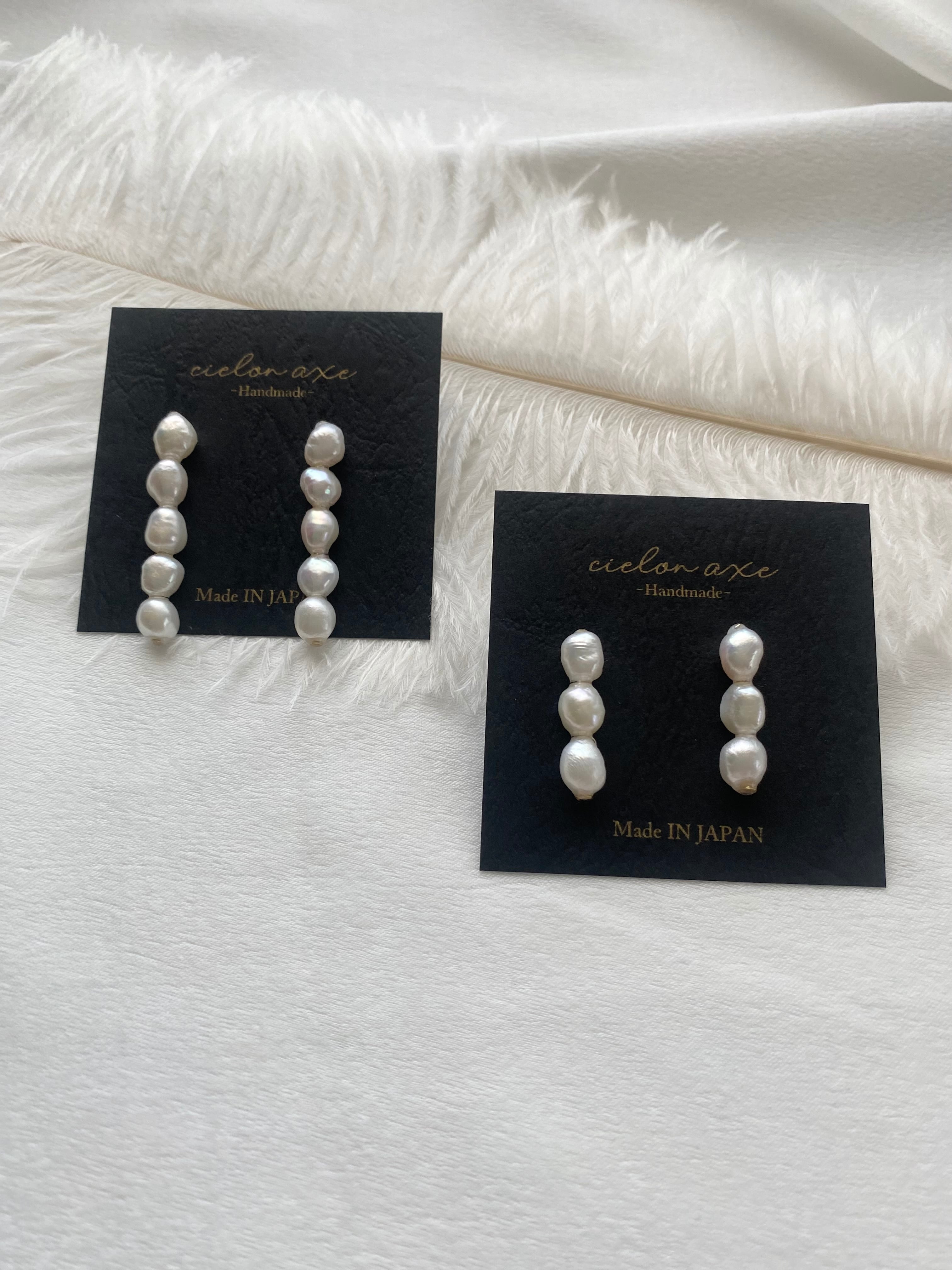 ひとつひとつ表情の異なるバロックパールを縦に連ね、耳元をすっきりと美しく見せてくれるデザインです。