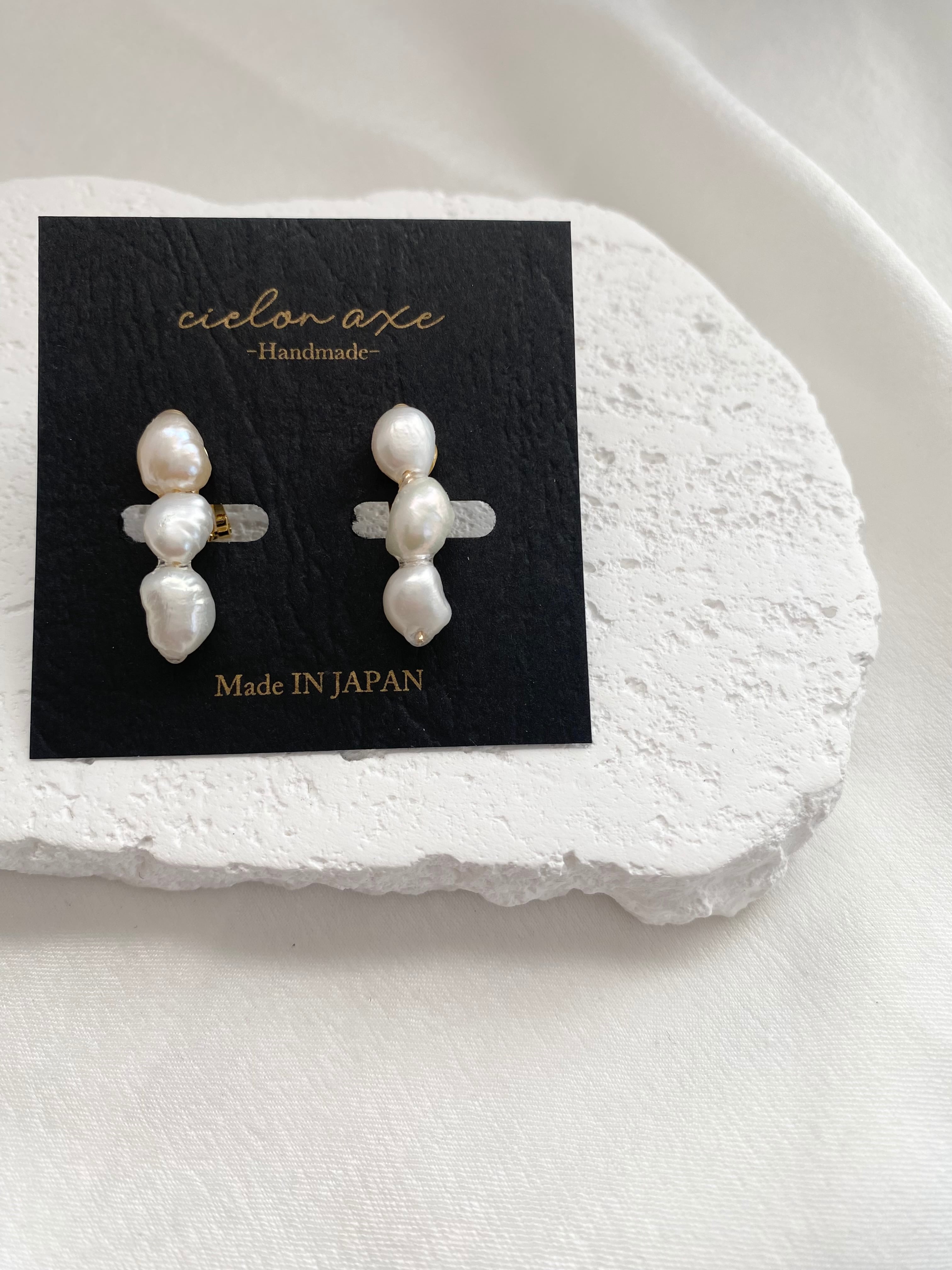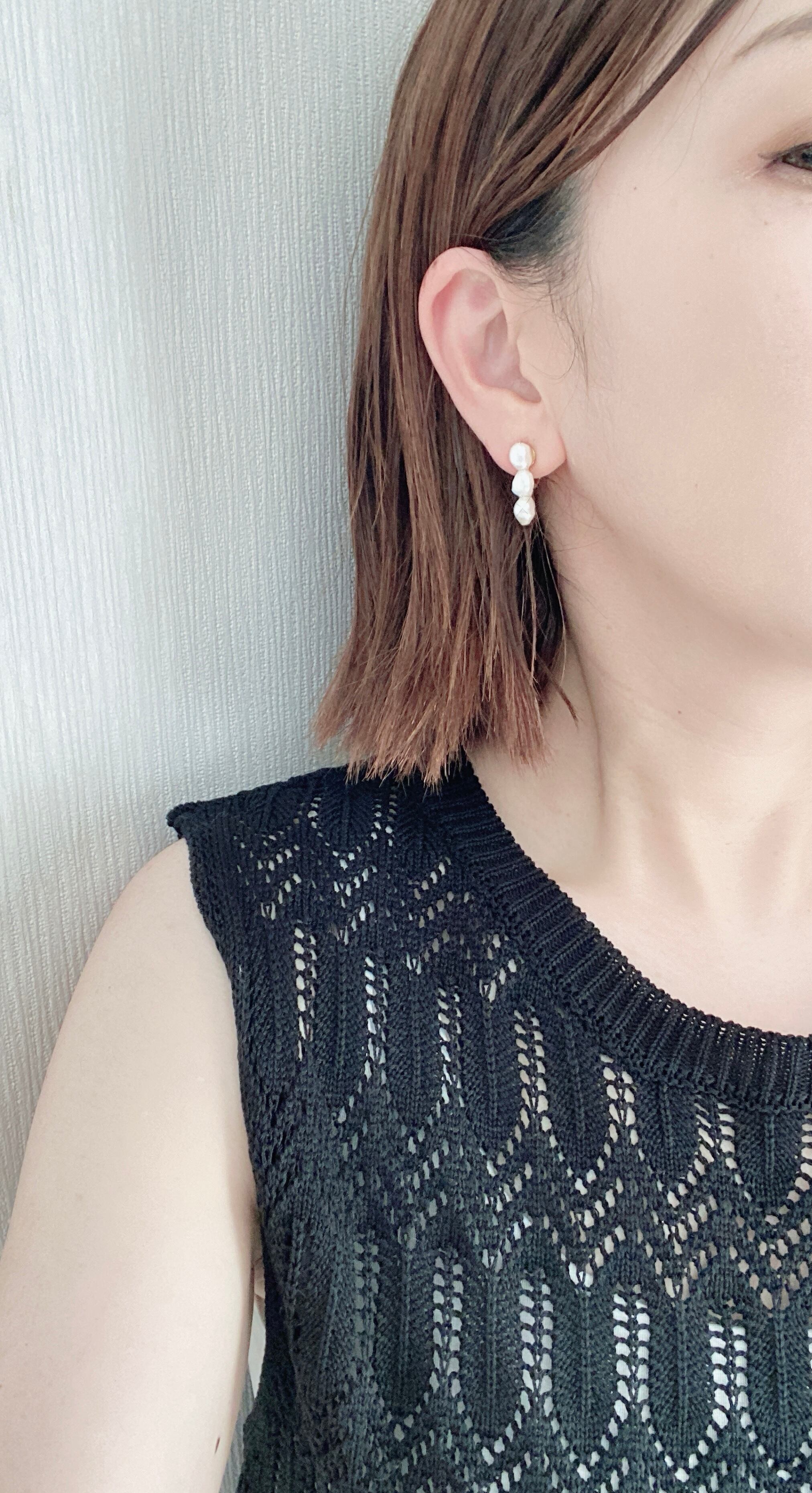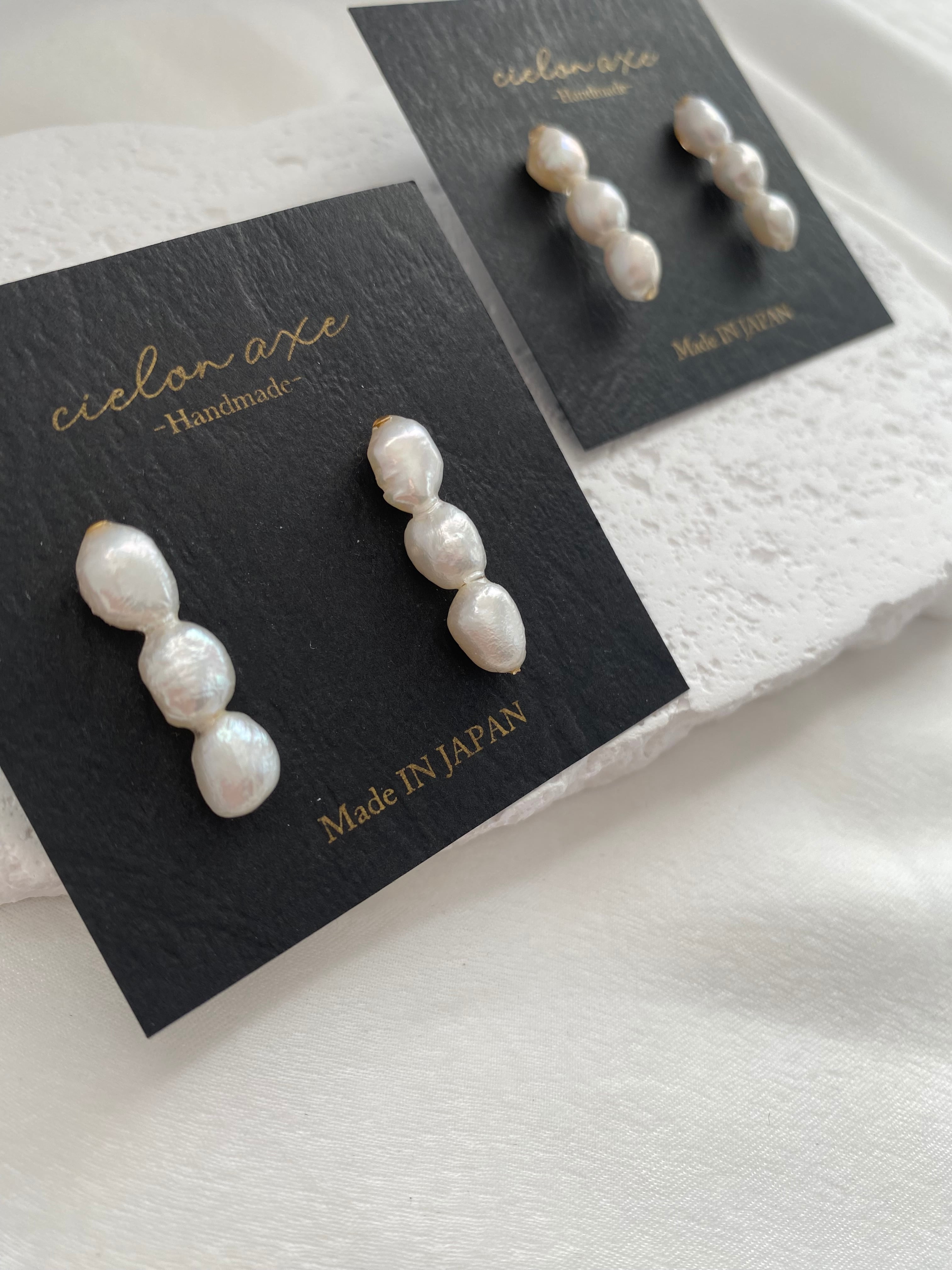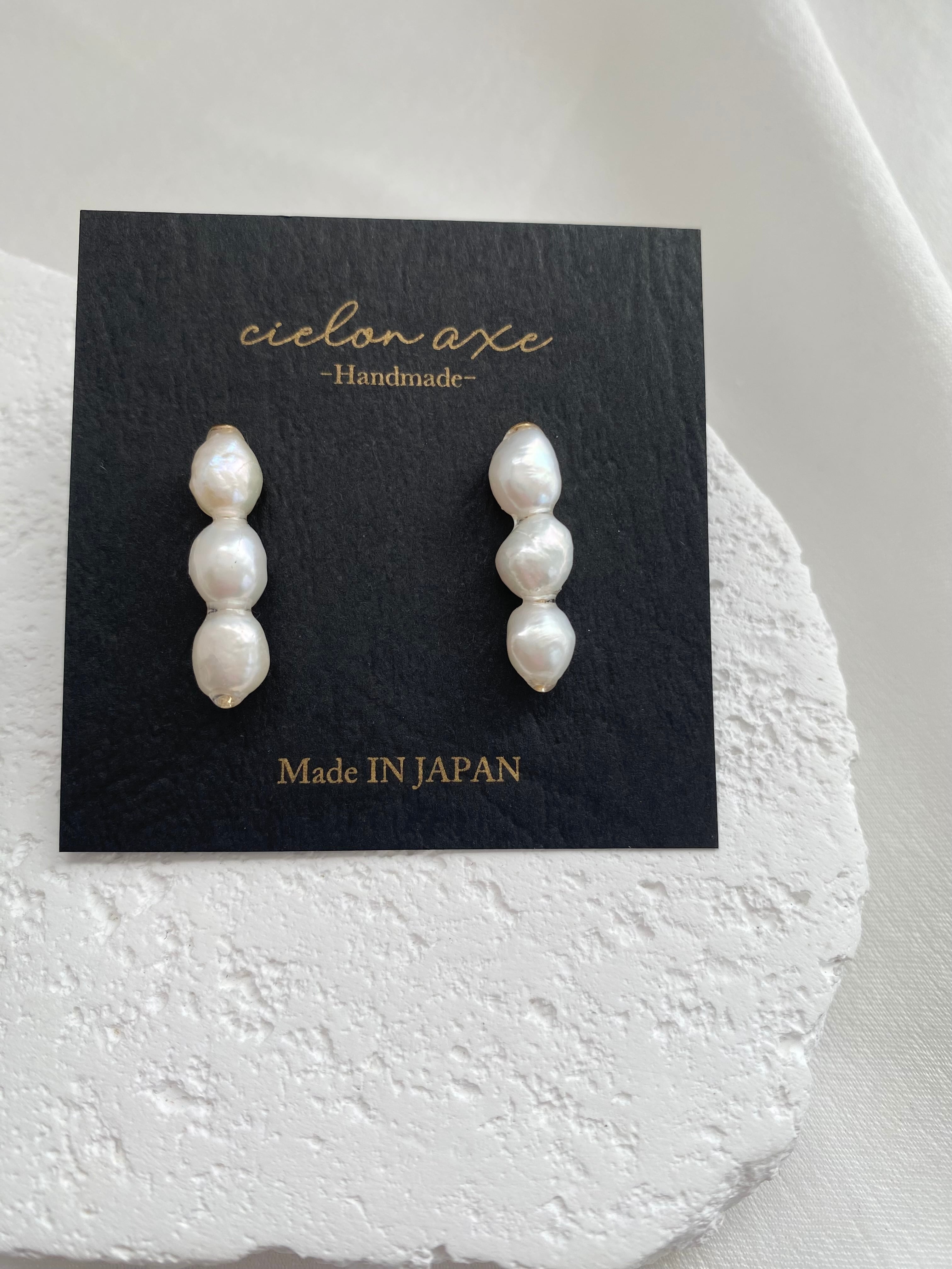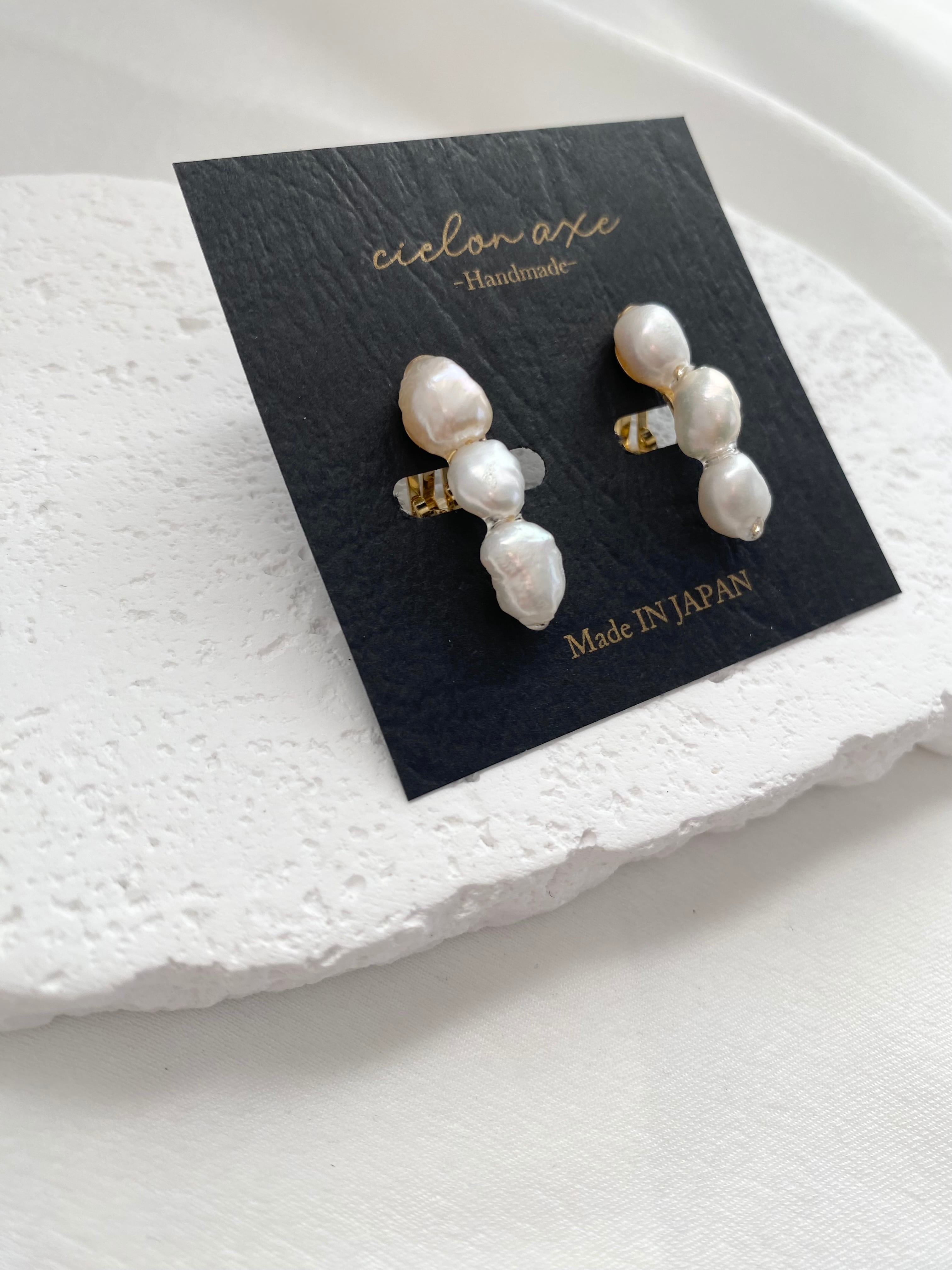 媚びない気品をまとい、ひとつひとつ表情の異なるバロックパールを縦に連ね、耳元をすっきりと美しく見せてくれるデザインです。