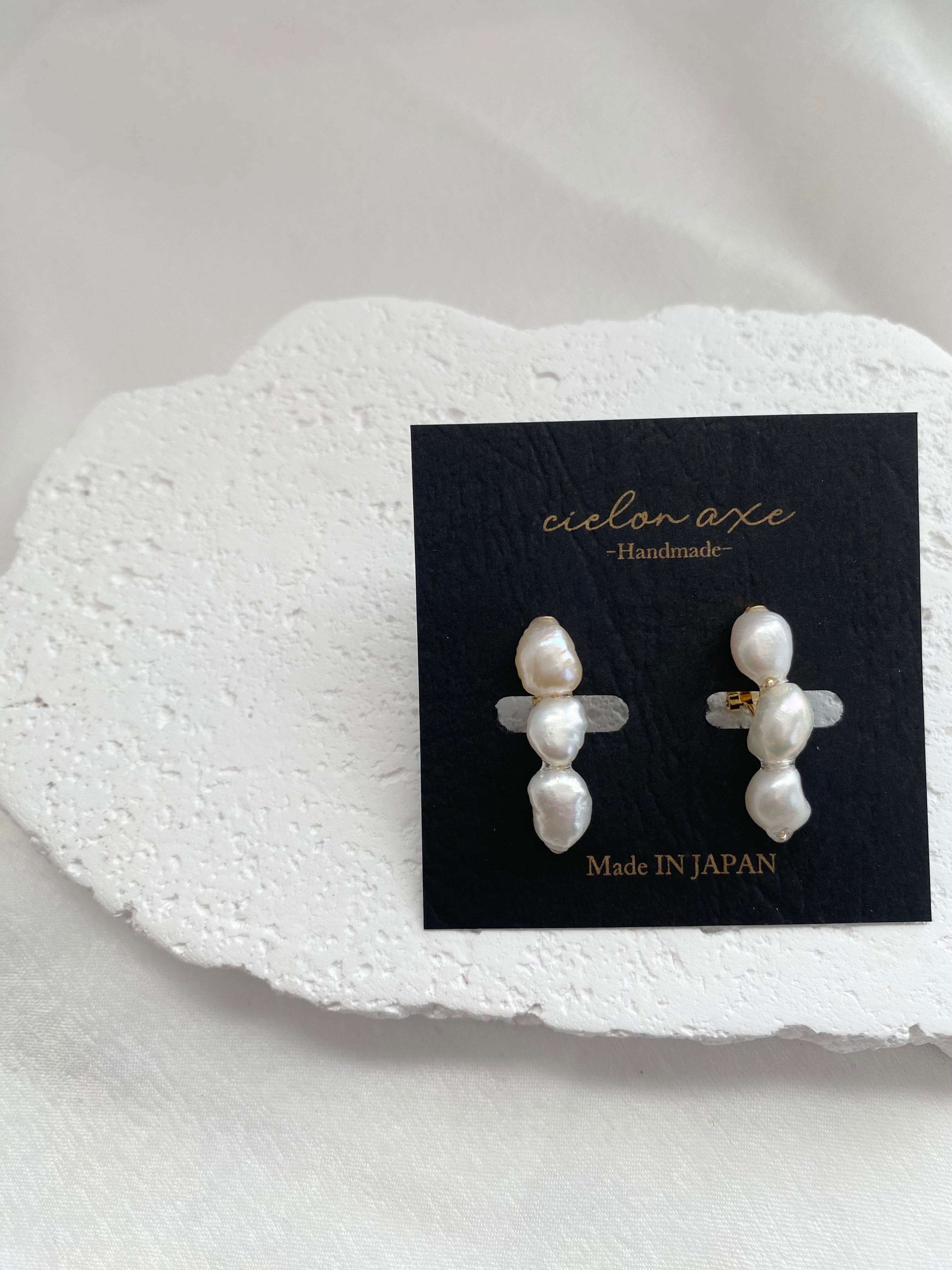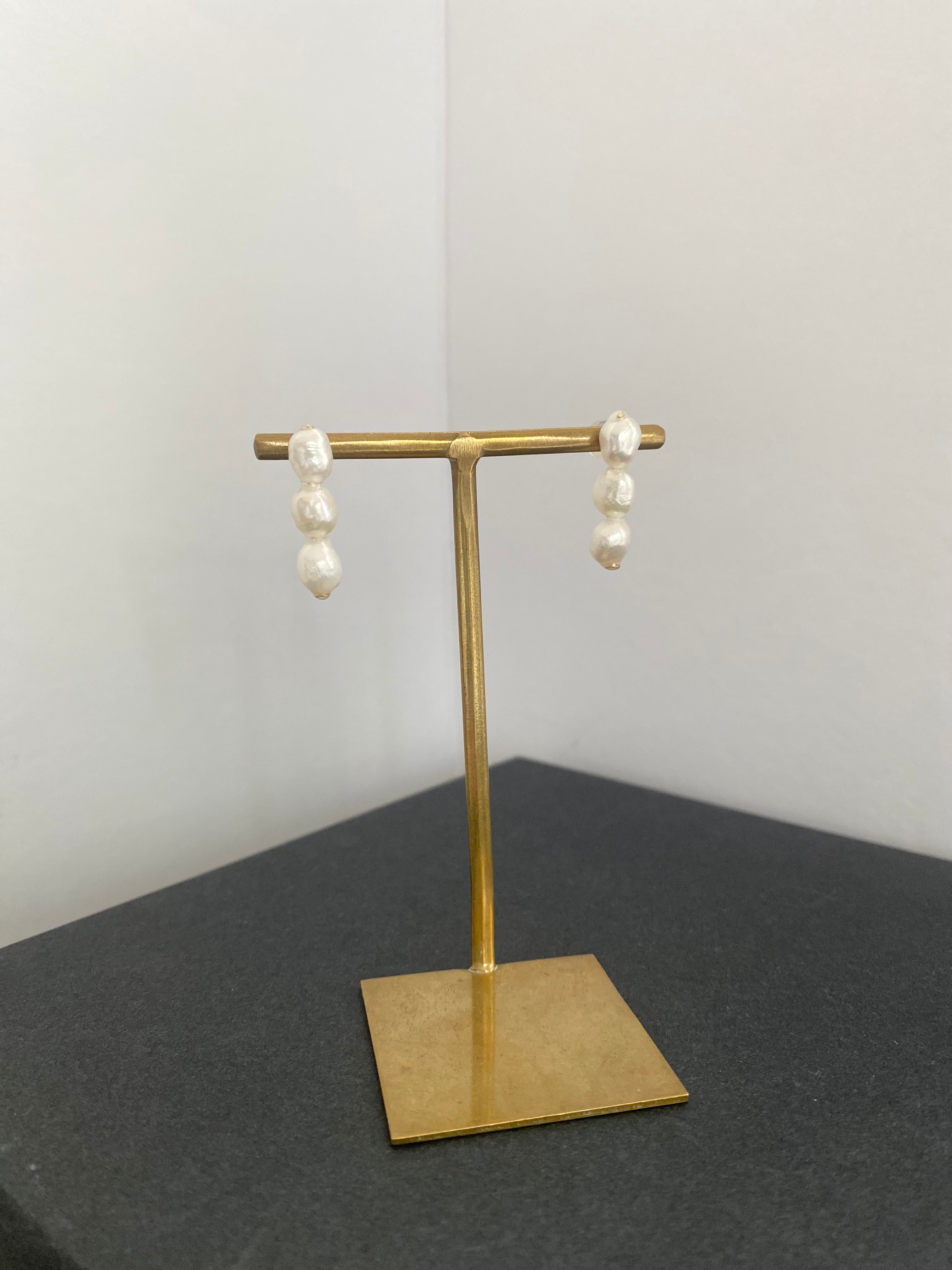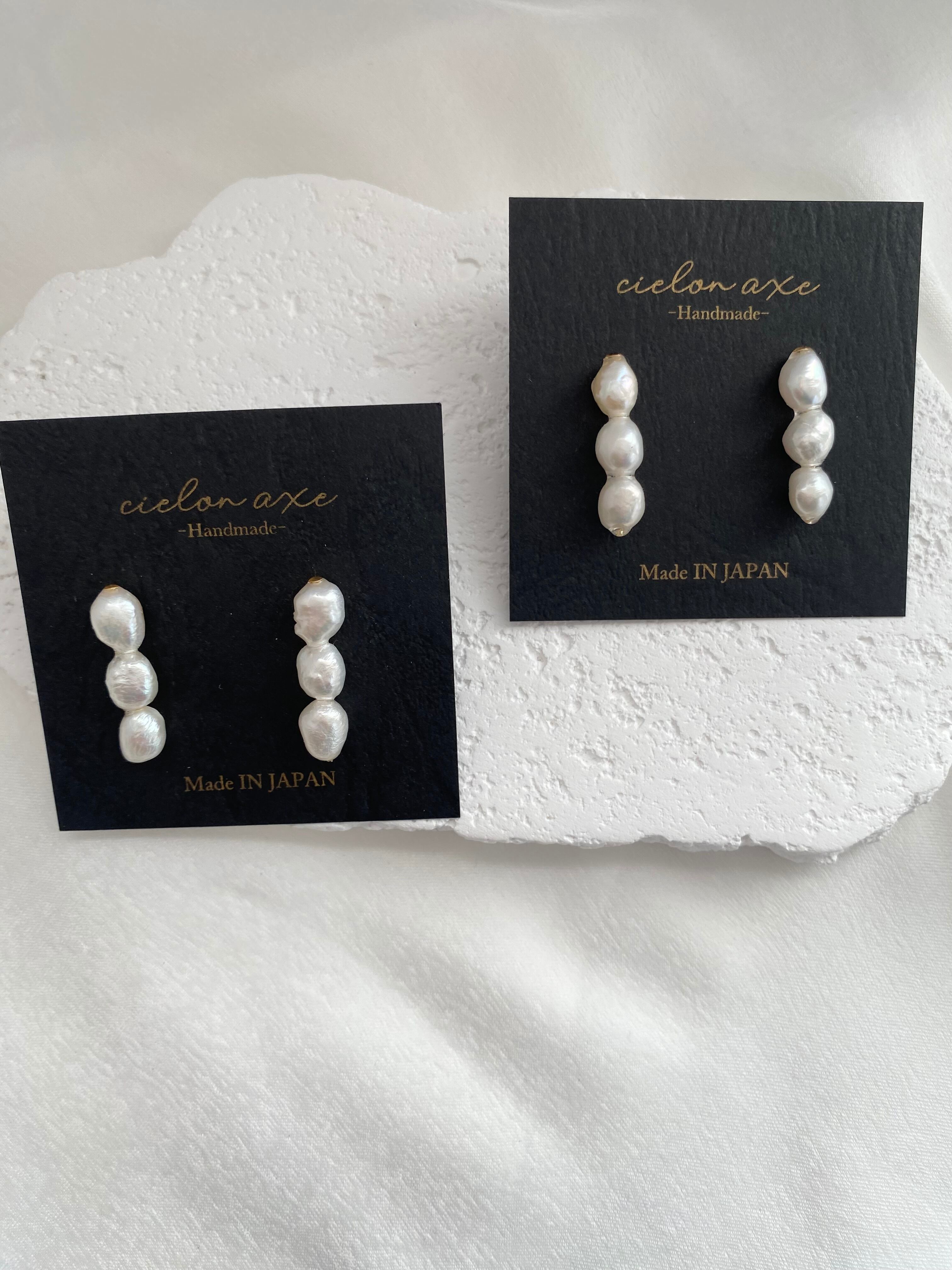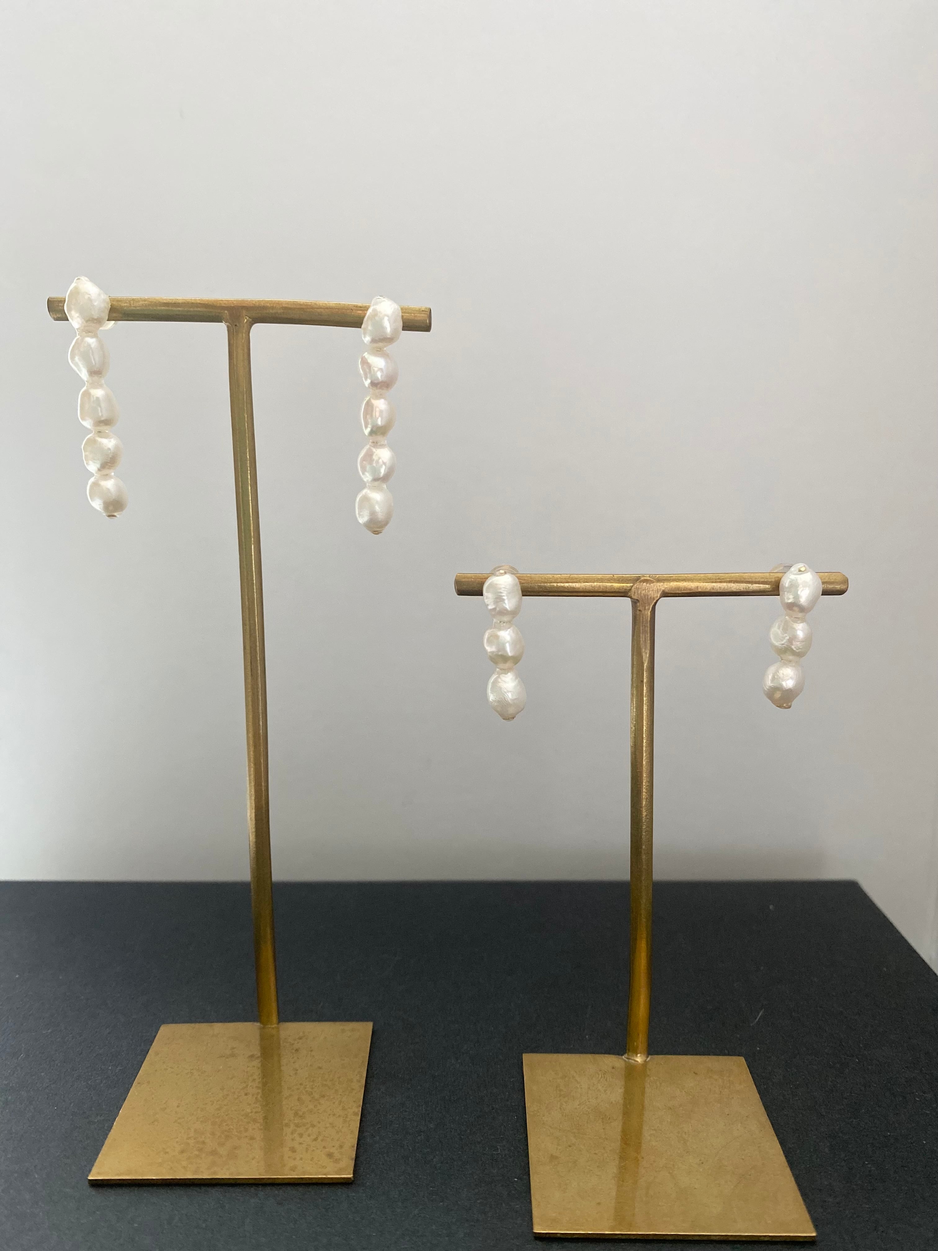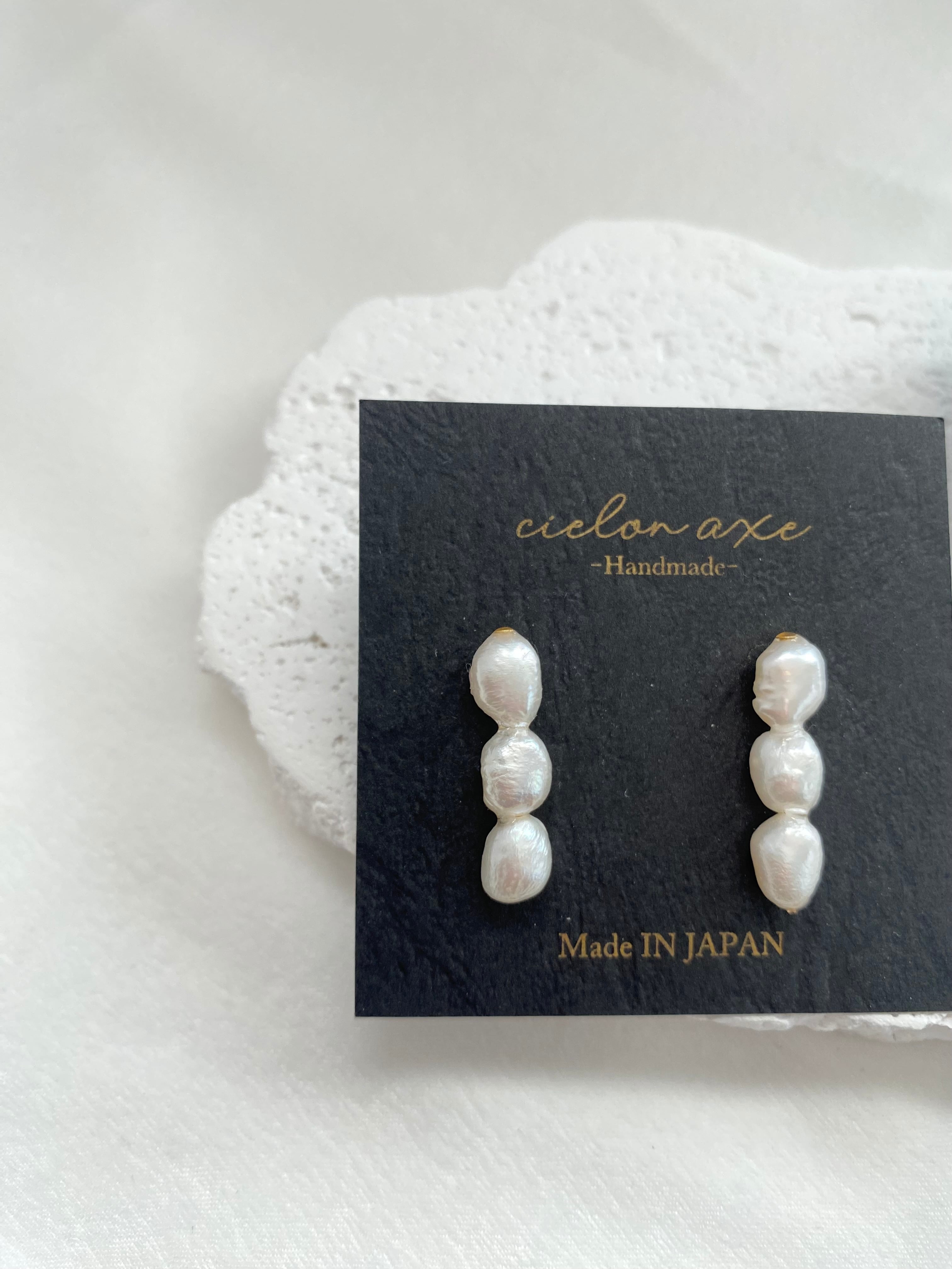 媚びない気品をまとい、ひとつひとつ表情の異なるバロックパールを縦に連ね、耳元をすっきりと美しく見せてくれるデザインです。