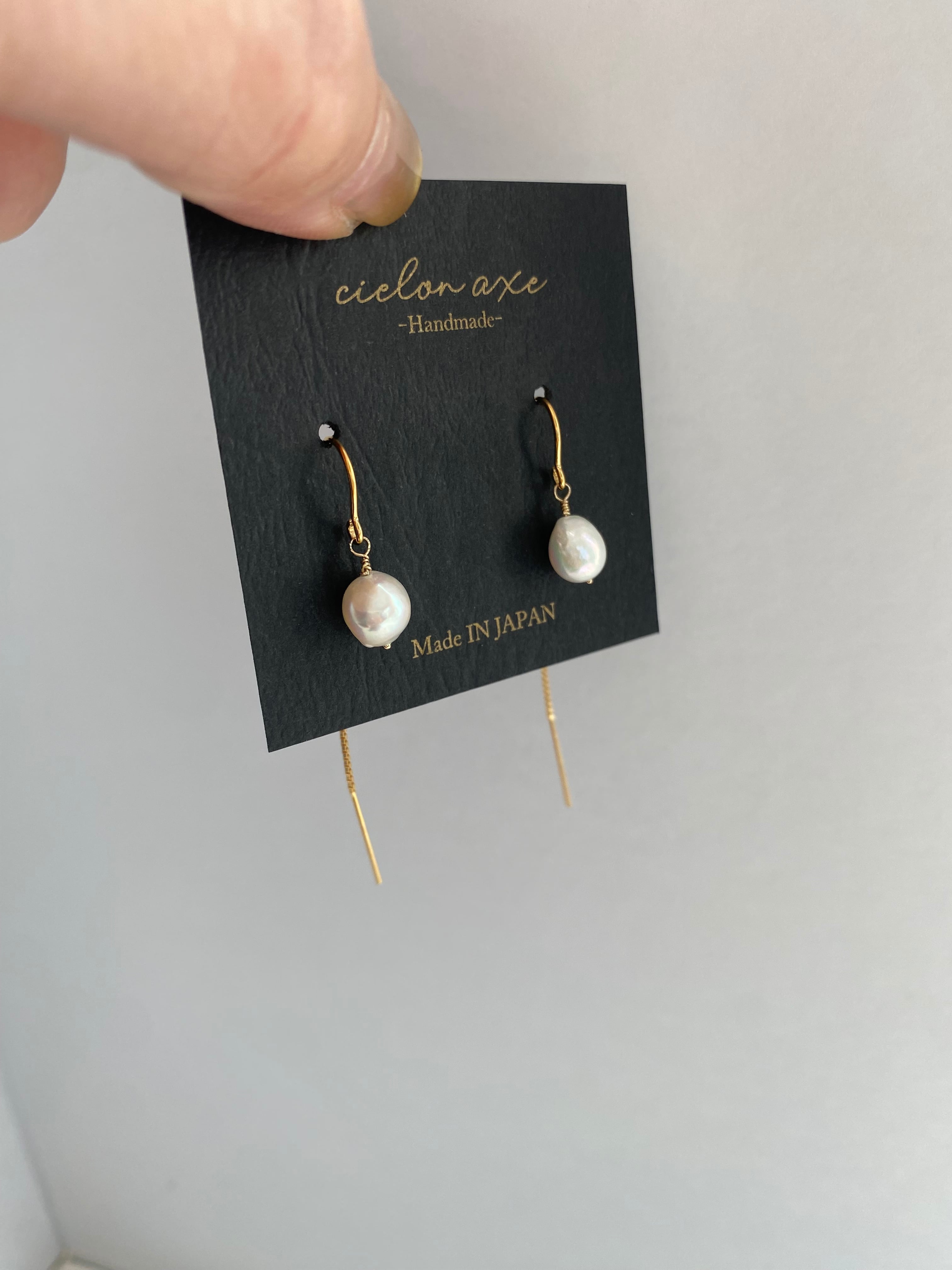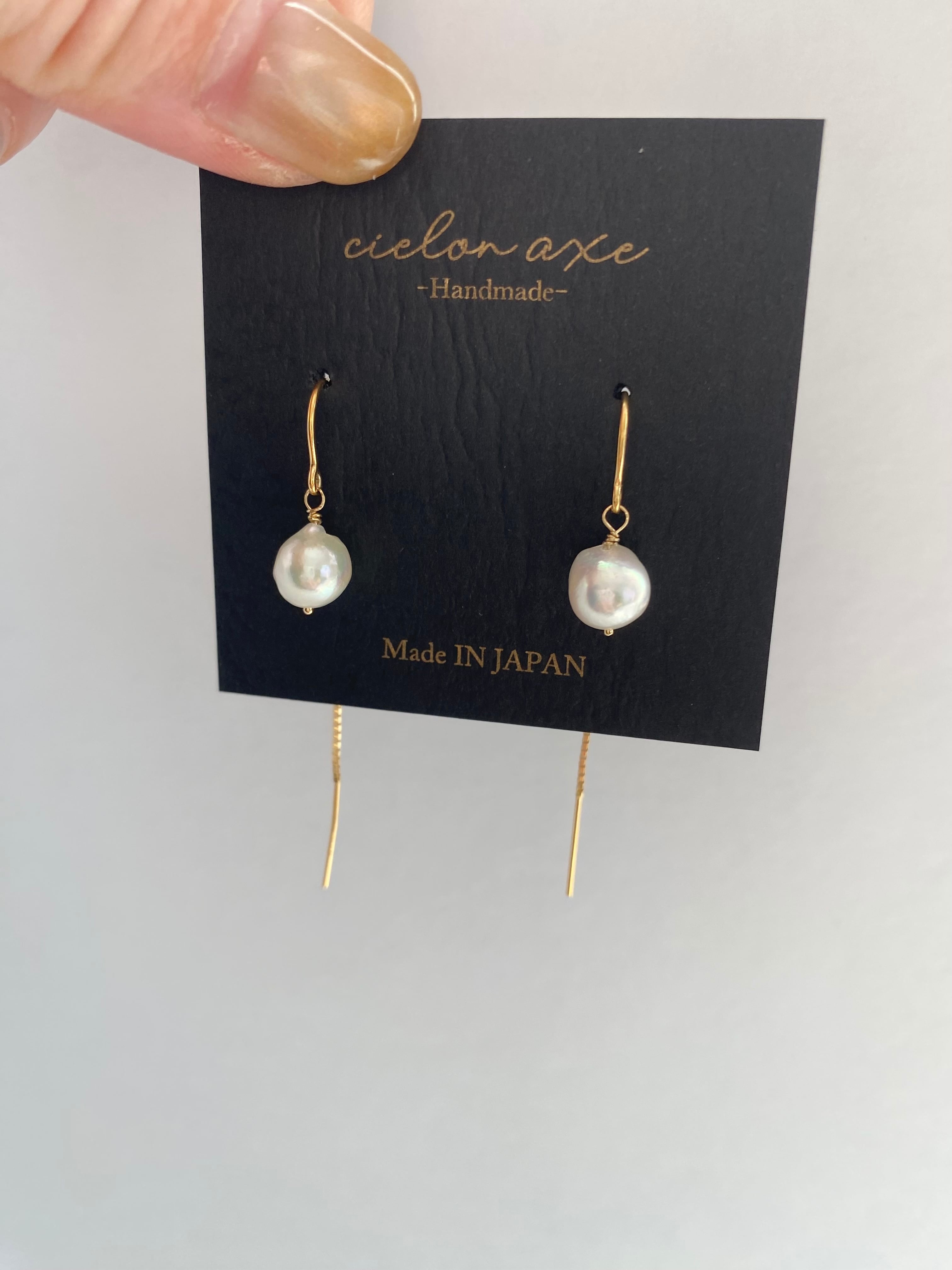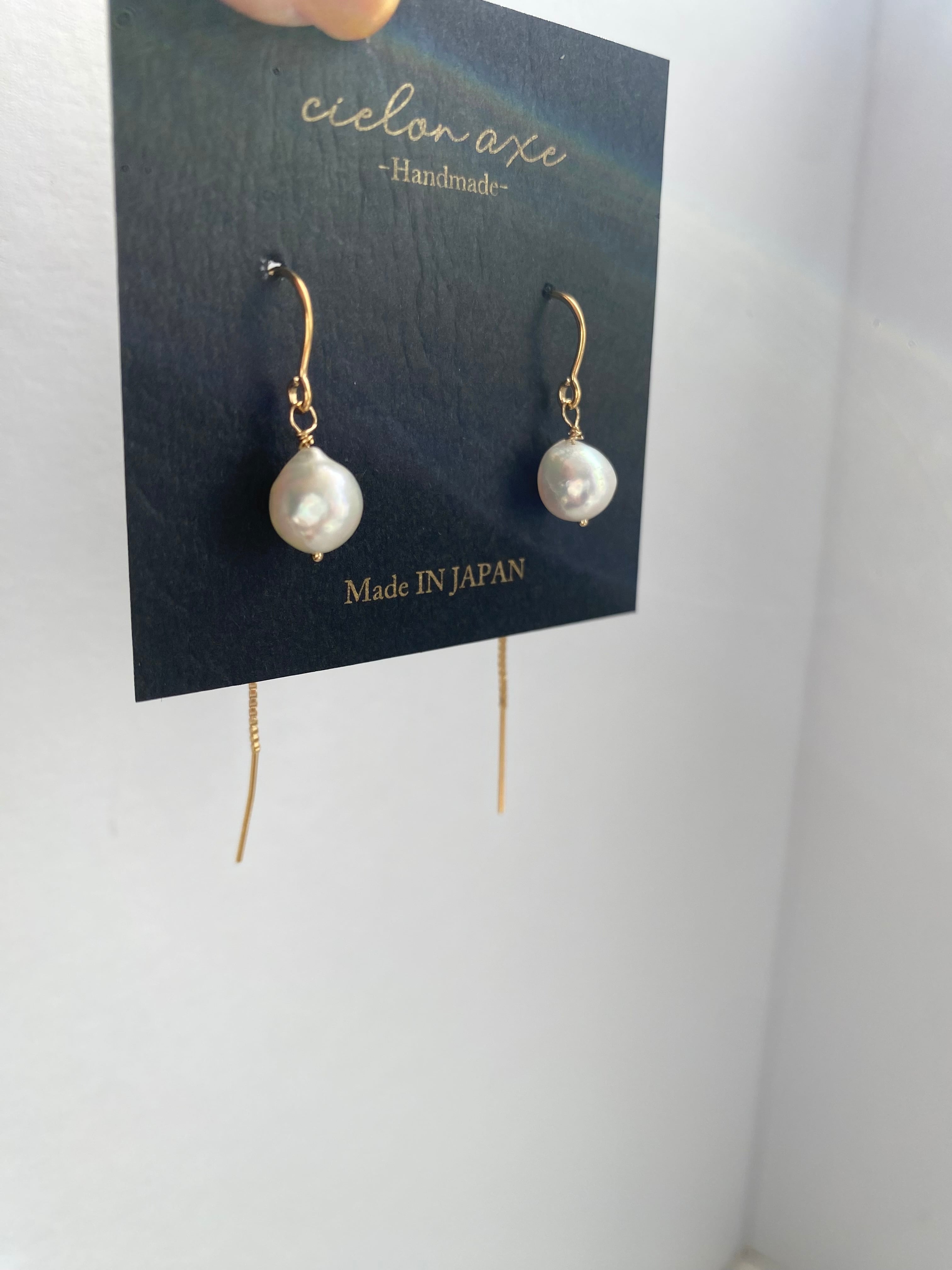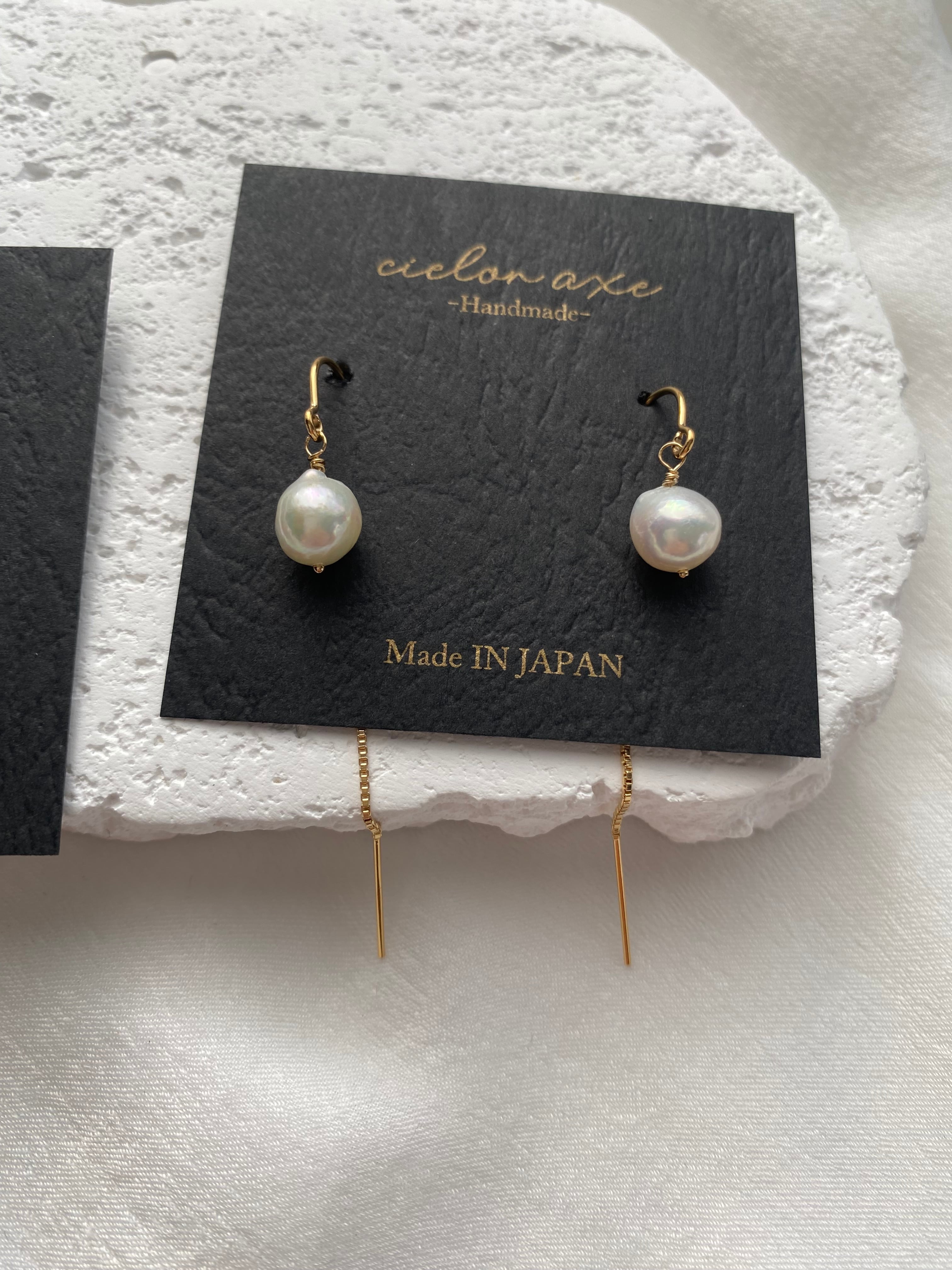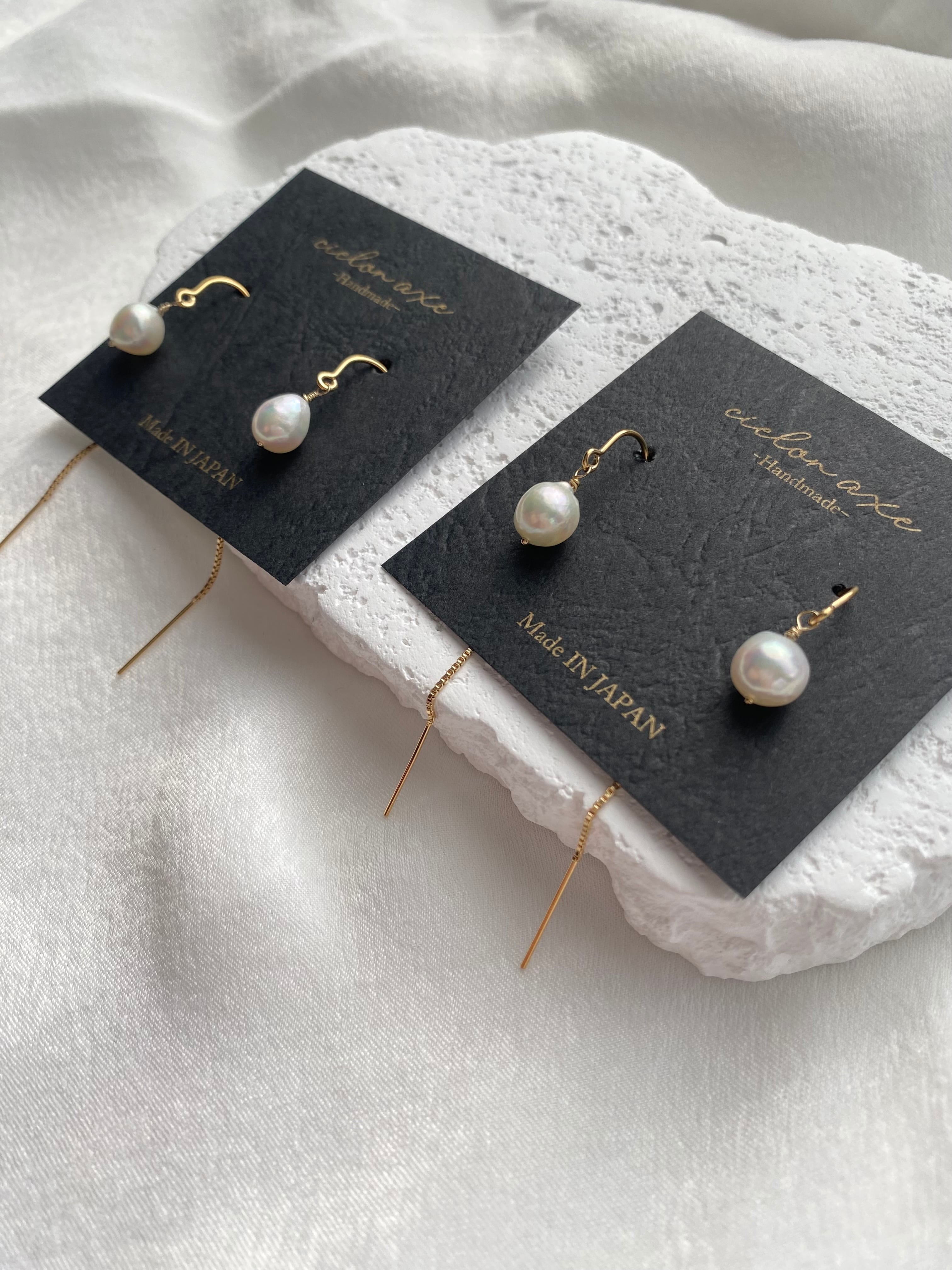 繊細なチェーンにあこや真珠が揺れるデザインは、動くたびに軽やかな輝きを添え、耳元を美しく演出。