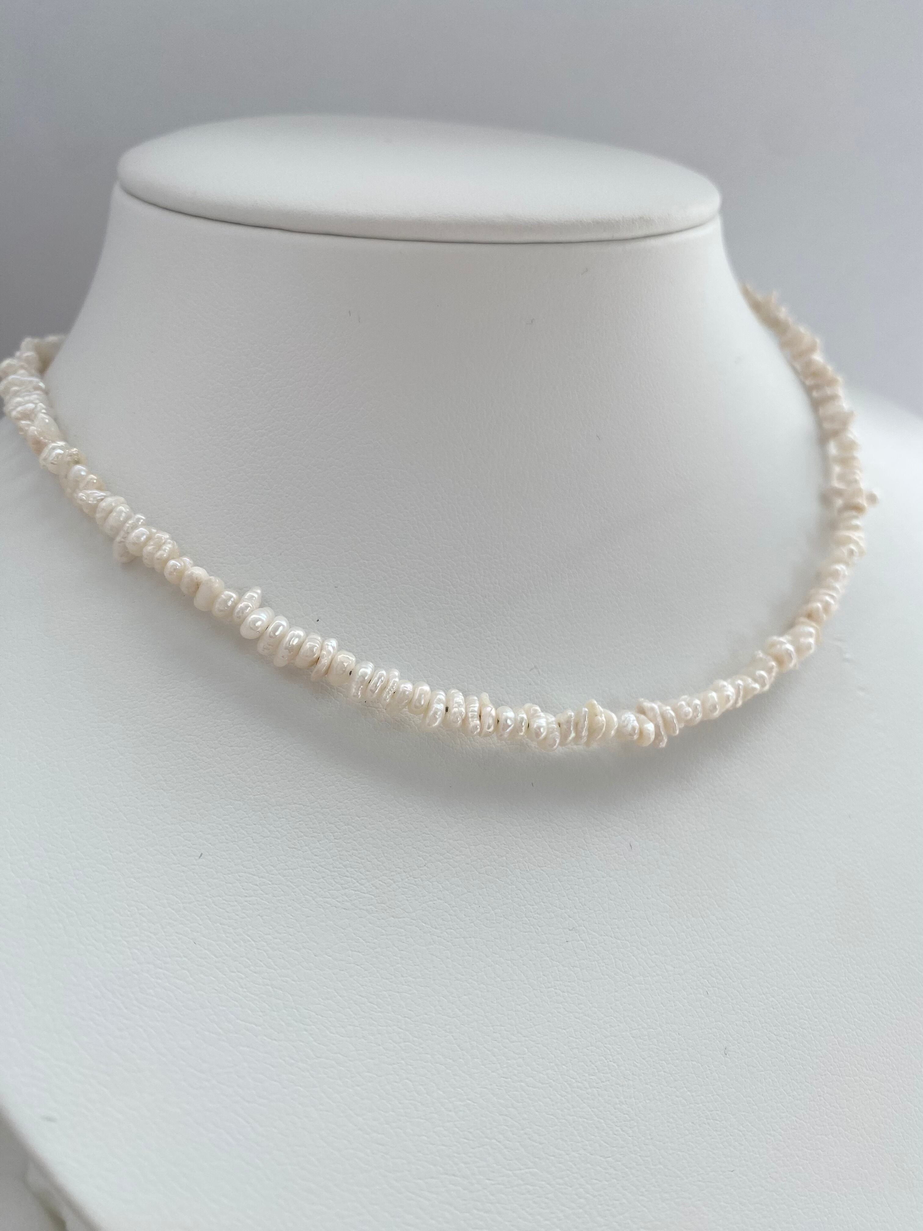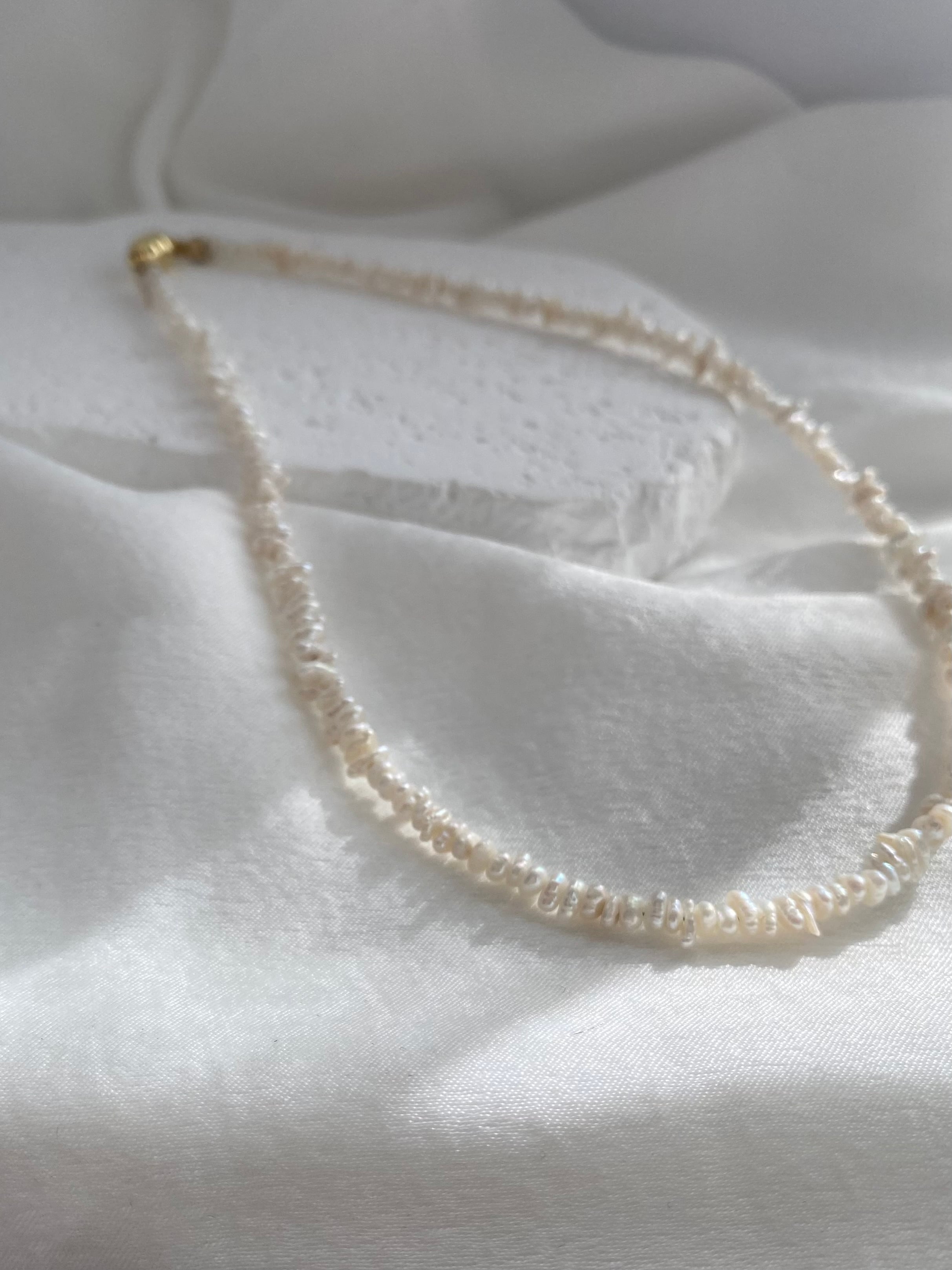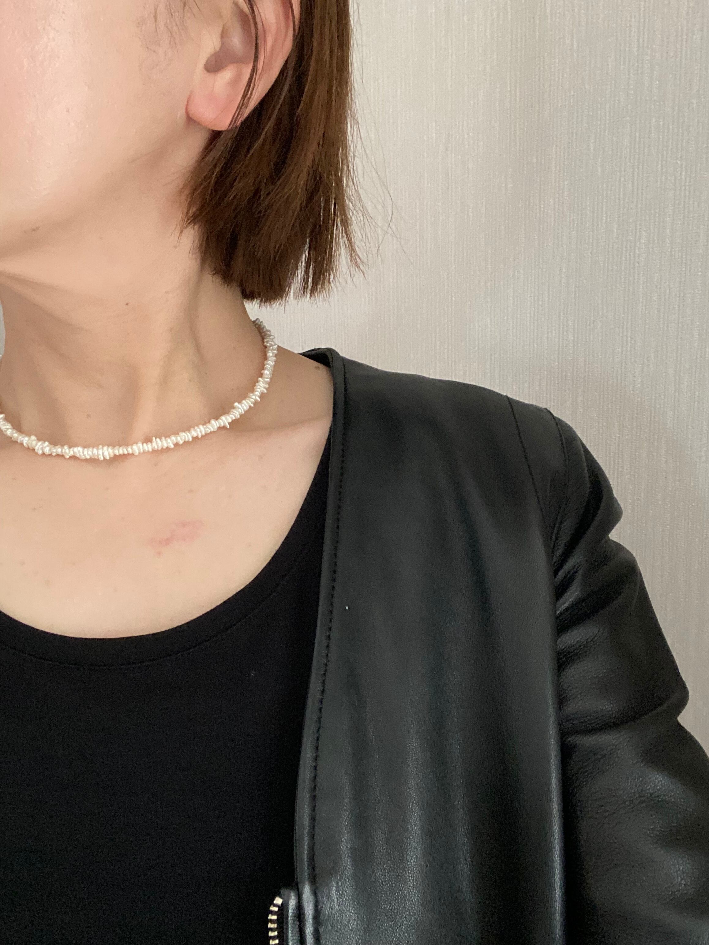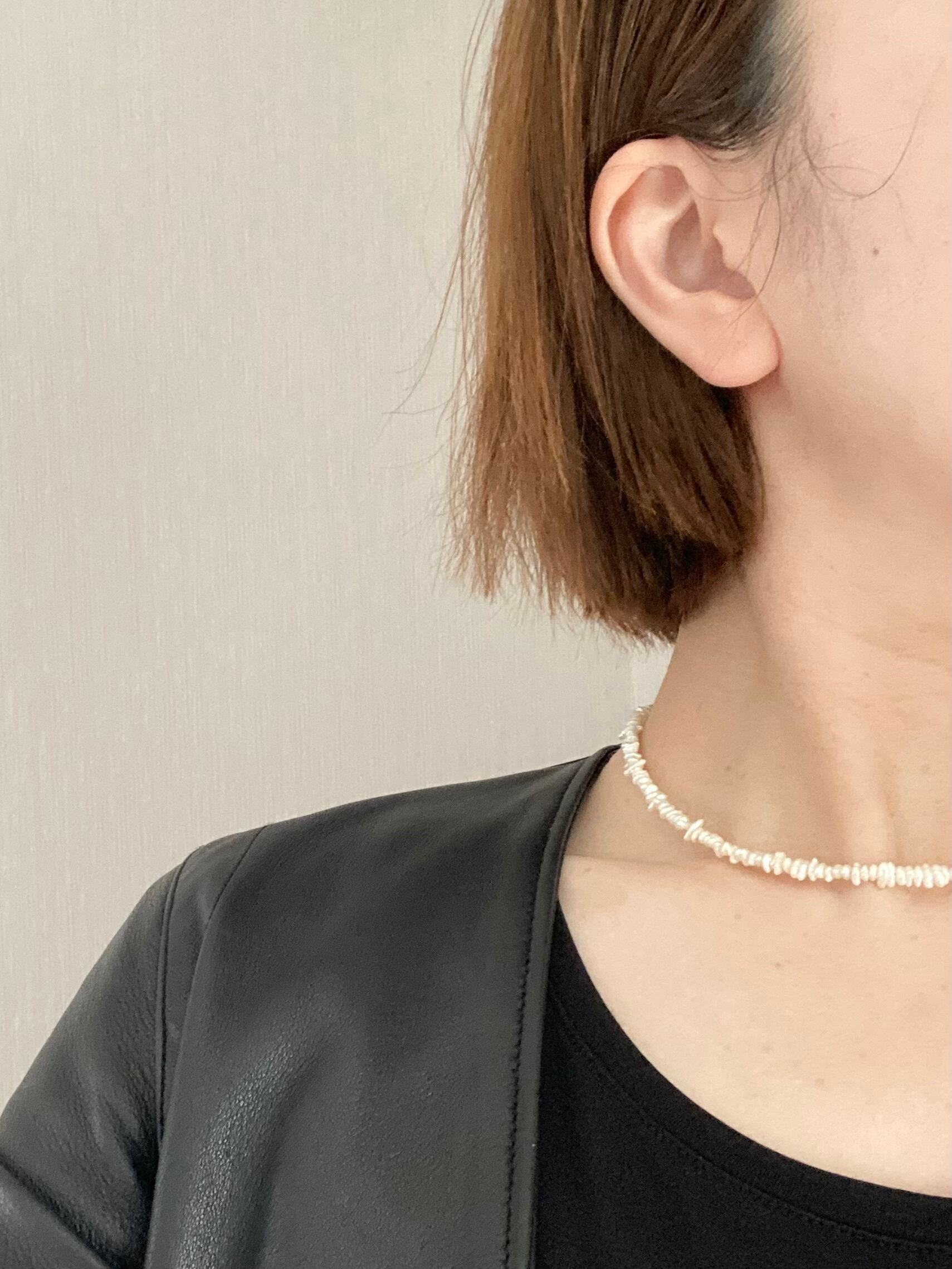 海の恵みを思わせる、やさしい色合いの淡水パールを連ねたネックレス。サンゴを思わせる独特の形と自然な光沢が、顔まわりに柔らかな華やぎを添えます。