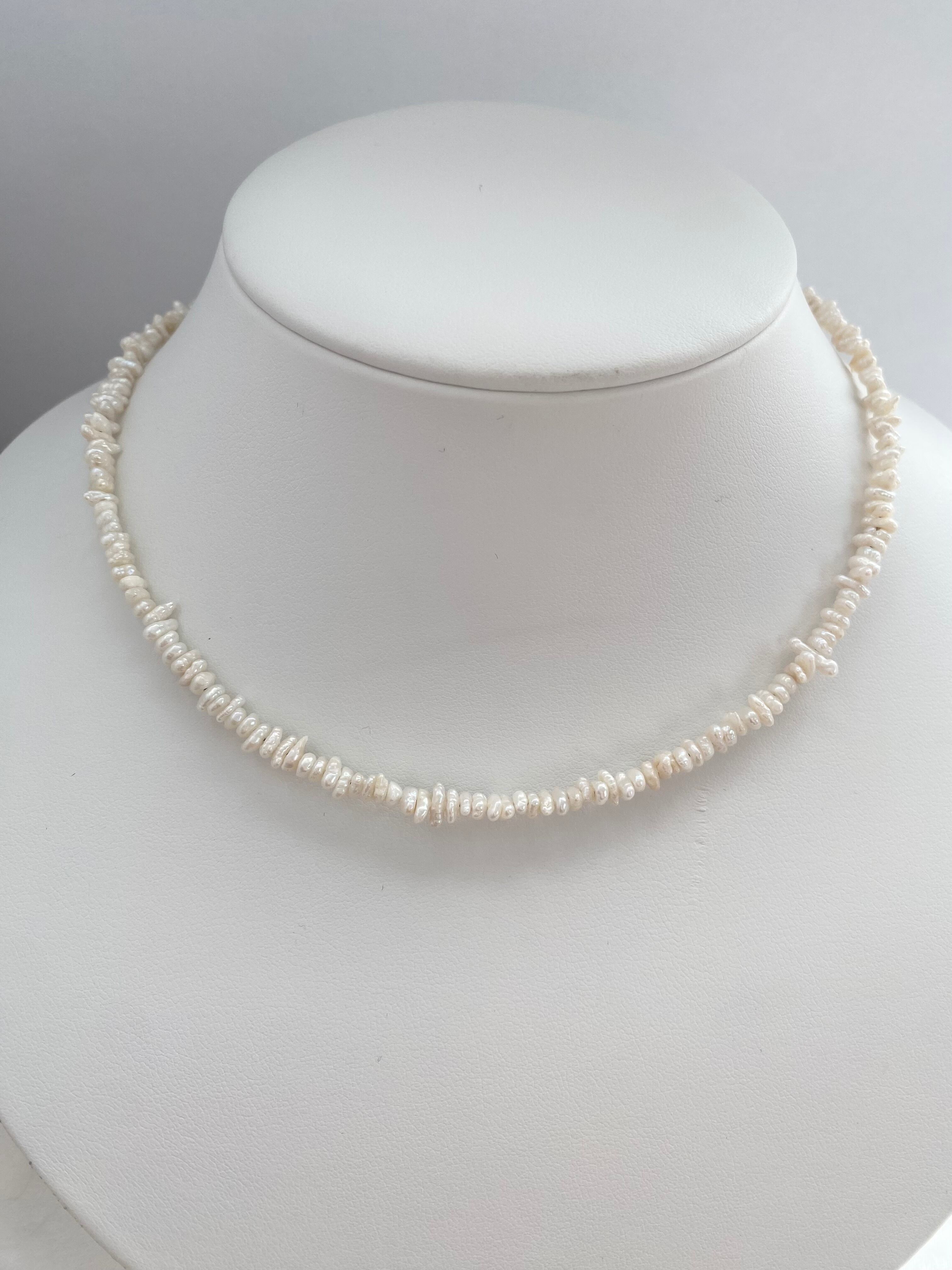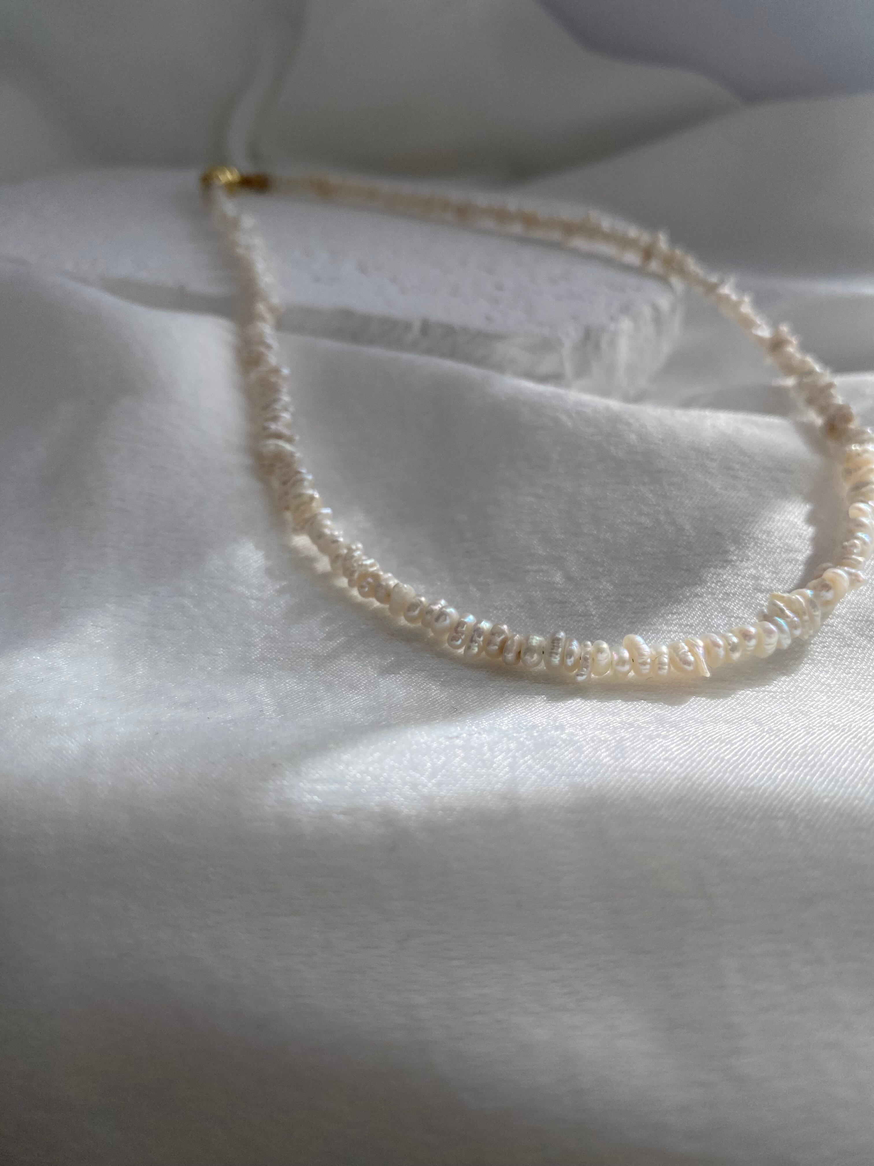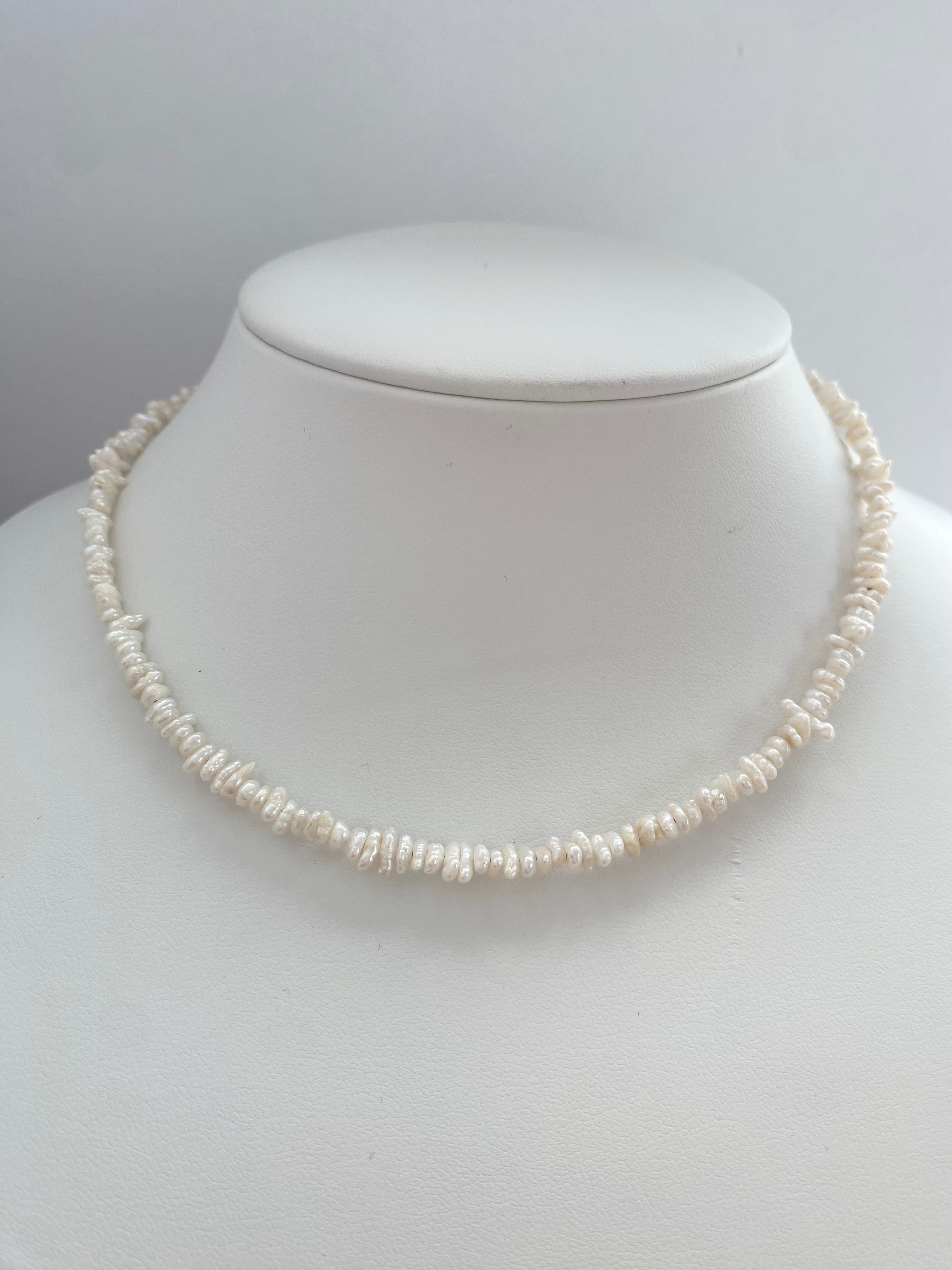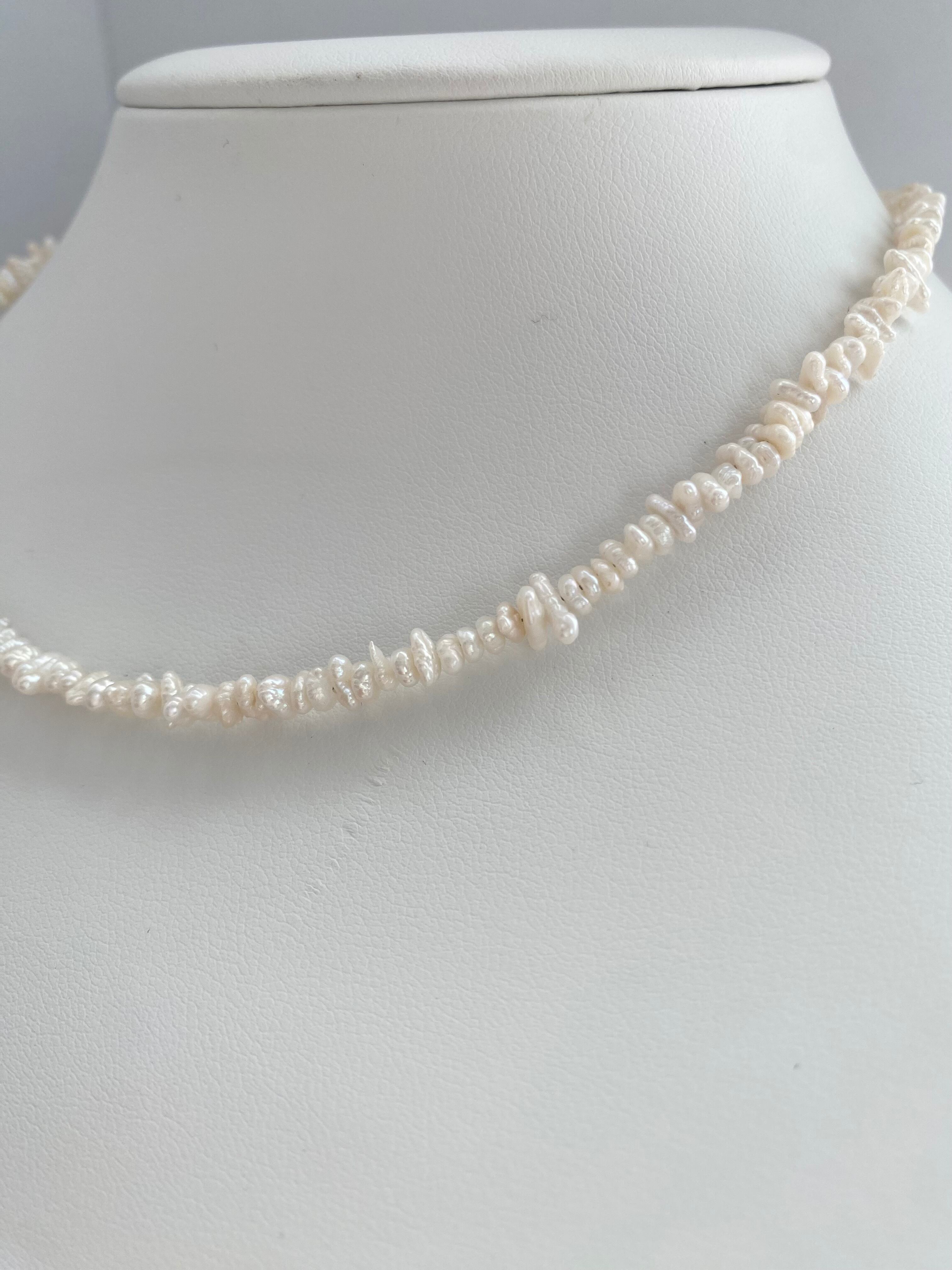 海の恵みを思わせる、やさしい色合いの淡水パールを連ねたネックレス。サンゴを思わせる独特の形と自然な光沢が、顔まわりに柔らかな華やぎを添えます。